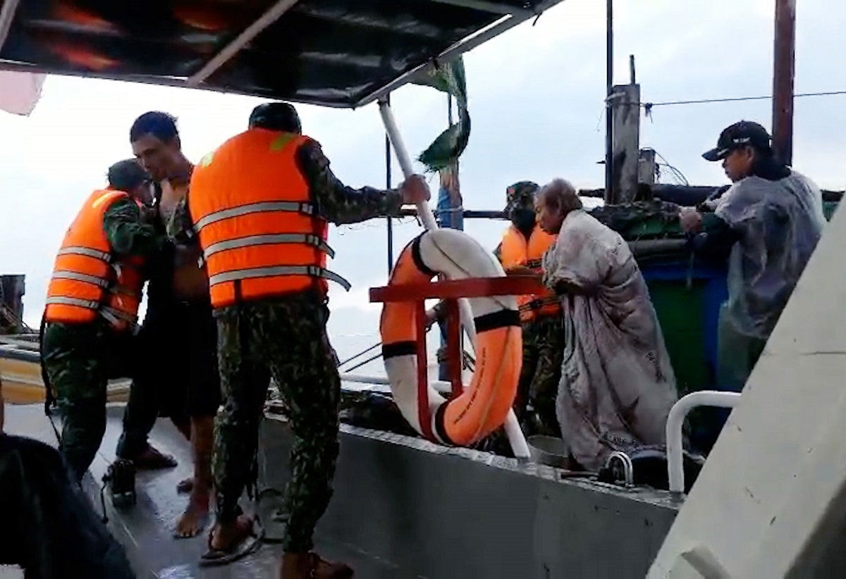 Lực lượng biên phòng đưa 5 ngư dân trên tàu cá bị chìm vào bờ an toàn. (Ảnh: H.A)