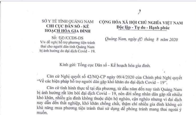 Theo nội dung văn bản, căn cứ vào Nghị quyết số 42 của Chính phủ “Về các biện pháp hỗ trợ người dân gặp khó khăn do đại dịch COVID-19”. Căn cứ tình hình thực tế tại địa phương, từ đầu năm đến nay tỉnh Quảng Nam bị ảnh hưởng rất lớn bởi đại dịch COVID-19 nên đời sống nhân dân gặp rất nhiều khó khăn. Nhiều gia đình không thuộc diện hộ nghèo, cận nghèo nhưng vì đại dịch nay dẫn đến thất nghiệp, khó khăn chồng chất. Thậm chí nhiều gia đình không có khả năng mua phương tiện tránh thai sử dụng để phòng tránh mang thai ngoài ý muốn.