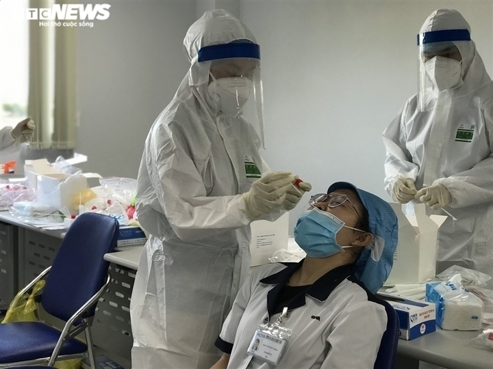 Lực lượng y tế lấy mẫu xét nghiệm cho người lao động của Công ty Hoya Lens Việt Nam - chi nhánh Quảng Ngãi.