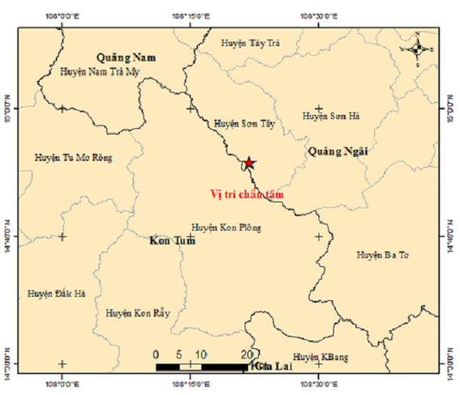 Theo đó, lúc 10 giờ 42 phút 50 giây cùng ngày, một trận động đất có độ lớn 2.8 độ richter xảy ra tại vị trí có tọa độ 14.895 độ vĩ Bắc, 108.366 độ kinh Đông, độ sâu chấn tiêu khoảng 8.1 km. Động đất xảy ra tại khu vực huyện Sơn Tây, tỉnh Quảng Ngãi. Cấp độ rủi ro thiên tai cấp 0.