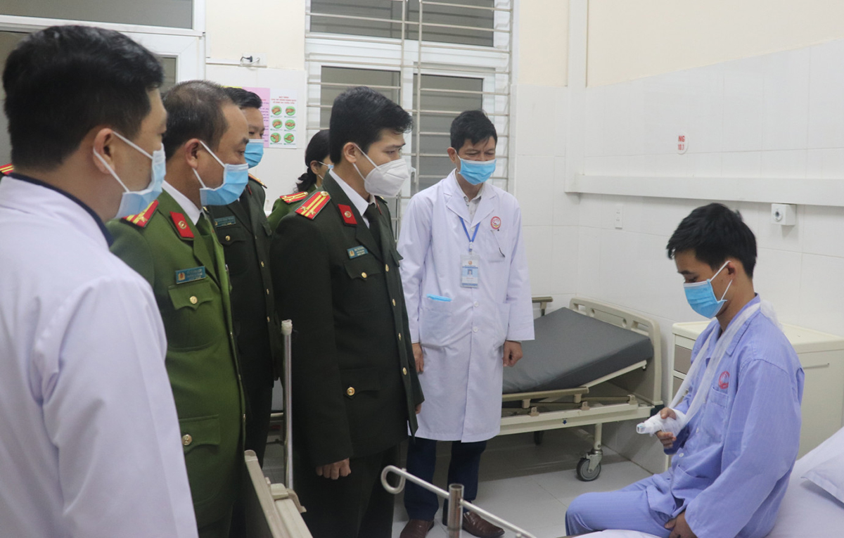 Trung tá Mai Thế Quang, Phó Giám đốc Công an tỉnh thăm hỏi, động viên Thiếu úy Phan Văn Hân.