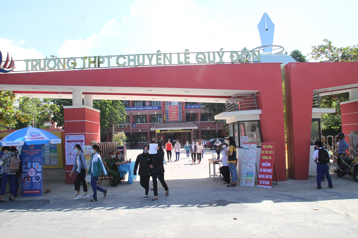 Các thí sinh ở điểm thi trường THPT chuyên Lê Quý Đôn (TP Đông Hà, tỉnh Quảng Trị) rời điểm thi sau khi kết thúc môn thi đầu tiên. (Ảnh: Đ.H).