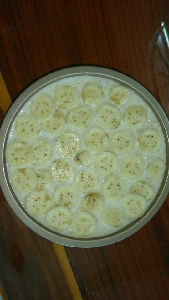 Xếp chuối thái lát lên trên bề mặt. Để bánh nghỉ trong 30 phút.