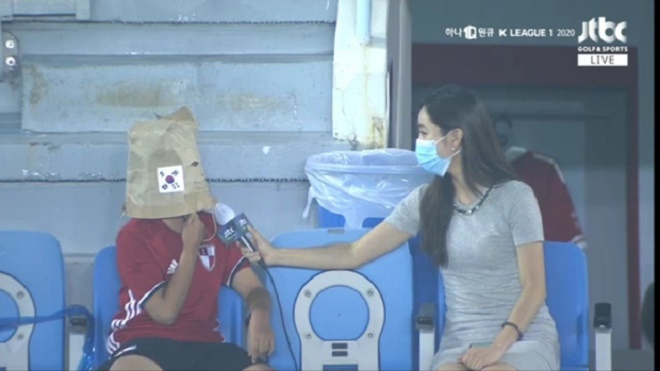 Tuy nhiên, khi nhập tâm xem bóng đá, hẳn sẽ rất khó để luôn luôn giữ chiếc khẩu trang bên mình. Một khán giả đến theo dõi trận đấu giữa Busan và Ulsan Hyundai đã gặp phải một rắc rối hy hữu. Anh chàng được một phóng viên nữ xinh đẹp của JTBC phỏng vấn nhưng chợt nhớ ra đang không đeo khẩu trang. Nhanh trí, CĐV này đã lấy ngay một chiếc túi giấy để... chụp lên đầu.