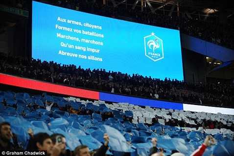 Tại trận giao hữu giữa ĐT Anh và ĐT Pháp đêm thứ ba 17/11 vừa rồi, Quốc ca Pháp đã được cử ngay trước khi trận dấu diễn ra. Hơn 7 vạn CĐV trên sân Wembley đã cùng nhau hát vang bài La Marseillaise.