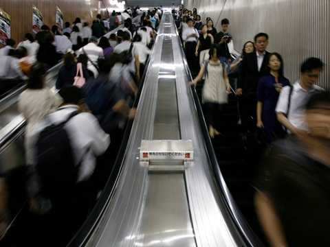 | Hành khách trên thang cuốn tại một ga điện ngầm ở Tokyo |