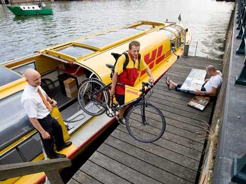 | Con tàu chuyên chở đồ phát nhanh qua các kênh rạch của thành phố Amsterdam |