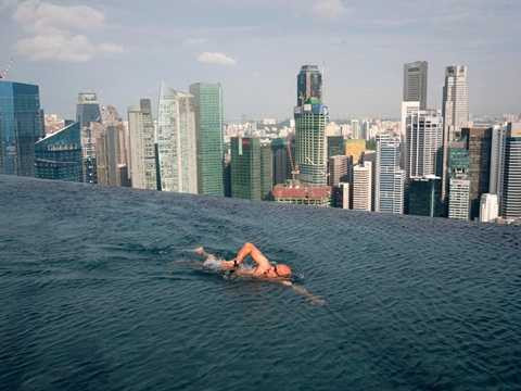 | Một vị khách tận hưởng bể bơi vô cực Skywalk trên đỉnh khách sạn Marina Bay Sands, Singapore |