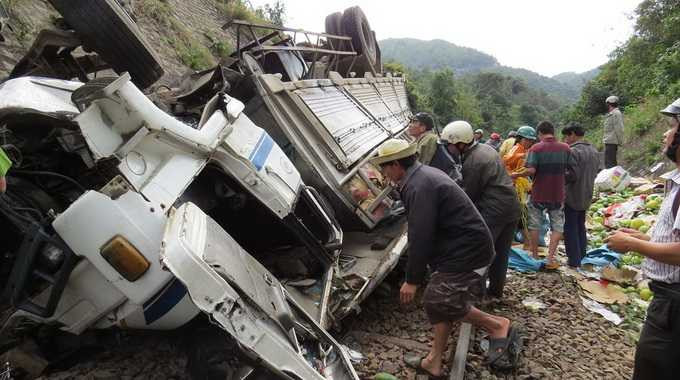Chiếc xe tải rơi từ độ cao 11,5m trên đèo Cả xuống đường sắt bên dưới - Ảnh: DUY THANH |