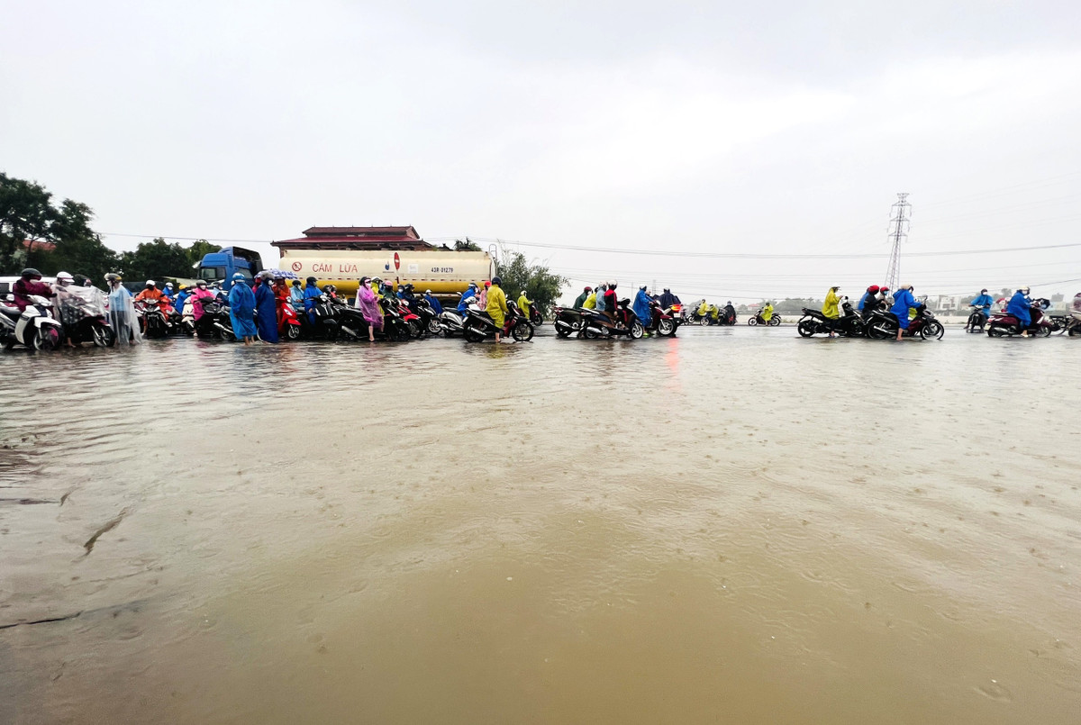 Quốc lộ 1A qua Quảng Nam ngập sâu, công nhân "chôn chân" giữa biển nước.