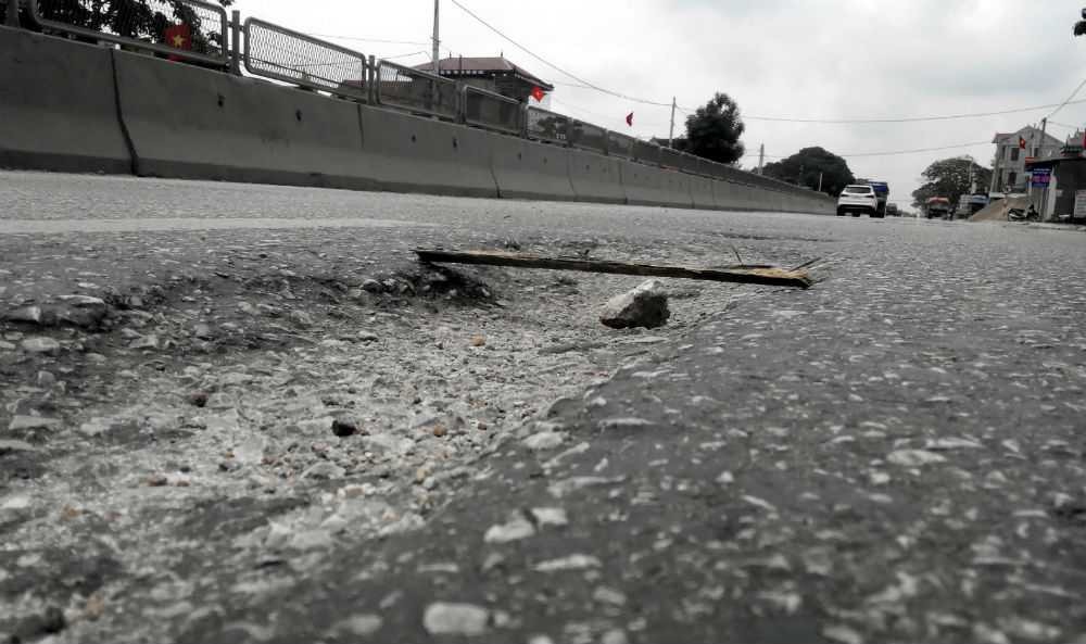 | Mặt đường QL1A bị bong tróc ở đoạn qua xã Quỳnh Giang do Công ty CP 482 (Cienco4) thi công. |