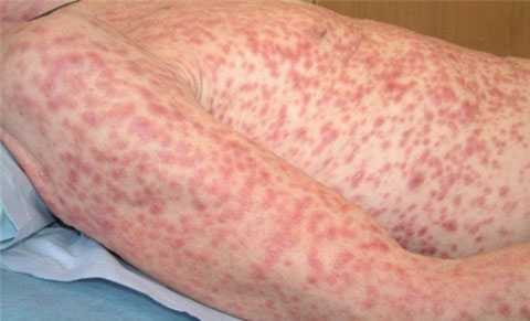 | Giang mai gây ra hiện tượng nổi mề đay, u cục trên da, các mề đay nổi thành từng mảng trên khắp cơ thể. |