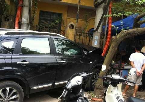 Chiếc xe vẫn chưa dừng lại, tiếp tục lao nhanh sang bên đường, đâm mạnh vào cột điện trên vỉa hè. Lúc này, có 3 người đang ngồi uống trà đá ở quán nước cạnh cột điện, rất may ba người này đã kịp chạy thoát.