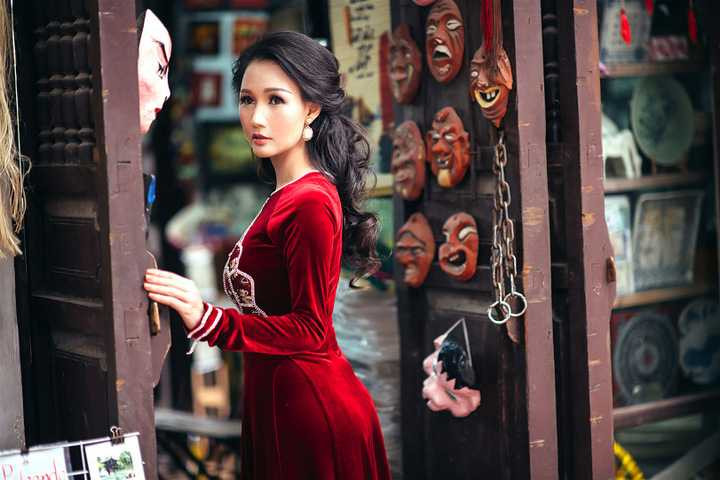 | Trong các thiết kế áo dài nhung với màu đỏ đun quý phái dành cho những ngày trở lạnh, bà mẹ ba con Sương Đặng đẹp kiêu sa mà nền nã trong những khung cảnh quen thuộc của phố cổ Hà Nội |