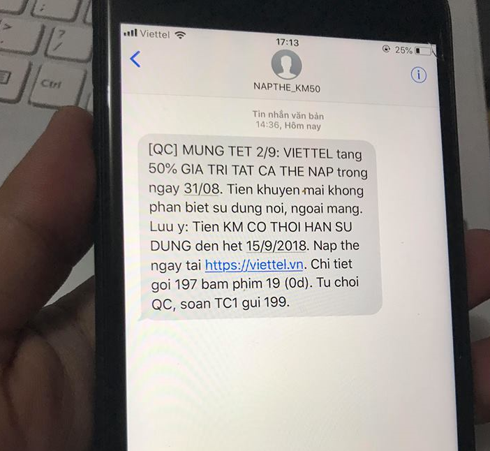 Trong ngày 30/8, rất nhiều thuê bao của 3 nhà mạng lớn là Vinaphone, Viettel và Mobifone nhận được tin nhắn khuyến mại 50% trong ngày 31/8.