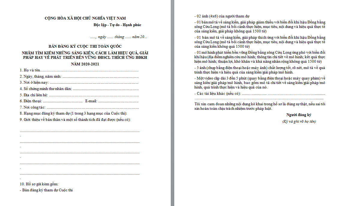 - 1 bản mô tả về sáng kiến, giải pháp thích ứng với biến đổi khí hậu Đồng bằng sông Cửu Long (mô tả bối cảnh thực hiện, mục tiêu, nội dung và hiệu quả thực tế của sáng kiến không quá 1500 từ)