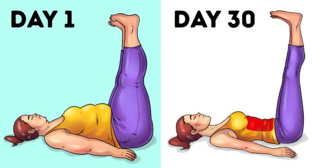 Ngoài ra, đưa chân lên cao cũng là một bài tập để hỗ trợ giảm cân, tăng cơ khá tốt. Nằm ngửa và đặt tay xuống sàn cho cân bằng. Từ từ nâng chân lên 10 đến 15 lần. Bạn sẽ bắt đầu nhận thấy sự cải thiện của cơ thể chỉ trong 30 ngày.