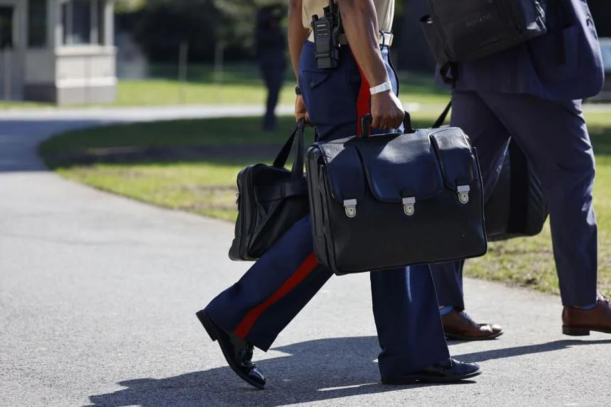 Một phụ tá quân đội của Tổng thống Mỹ Biden xách chiếc cặp hạt nhân có chứa mật mã triển khai vũ khí hạt nhân. (Ảnh: Bloomberg)