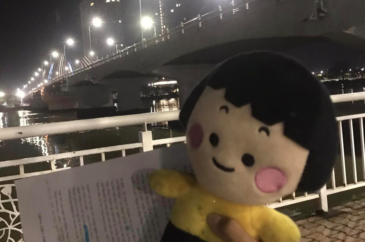 Đi cùng với lời thuật lại câu chuyện là 4 góc ảnh khác nhau bên bờ cầu sông Hàn với nhân vật chính trong bức hình làm con búp bê đồ chơi đáng yêu. Theo lời kể của chủ bài viết, đó chính là món quà bất ngờ mà một cụ ông tập thể dục ở khu vực ấy đã tặng cho cô.