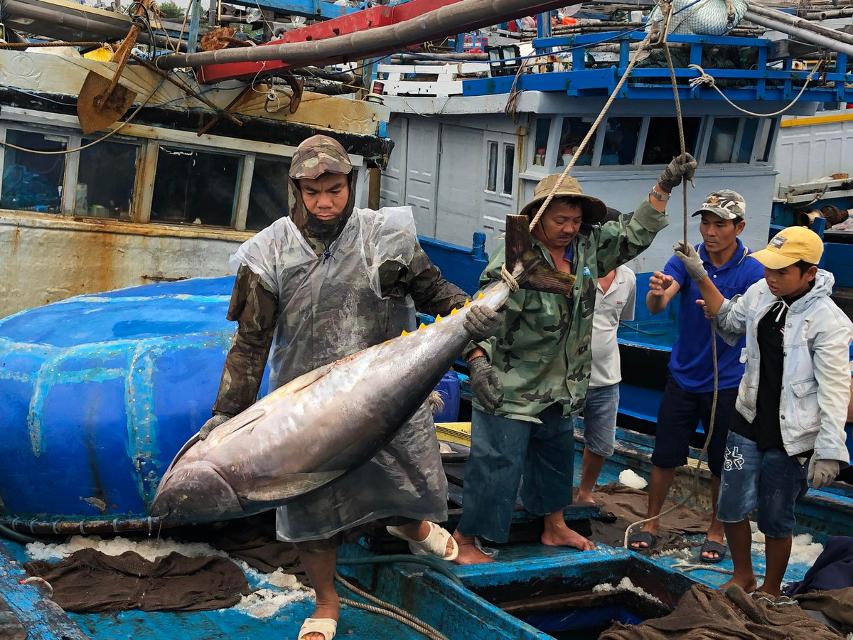 Vừa về bờ sau hơn 60 ngày bám biển đánh bắt cá ngừ đại dương, ông Nguyễn Văn Thiên (40 tuổi, trú phường Phú Đông, TP Tuy Hòa) đang cùng bạn thuyền vận chuyển những mẻ cá vào bán cho thương lái.