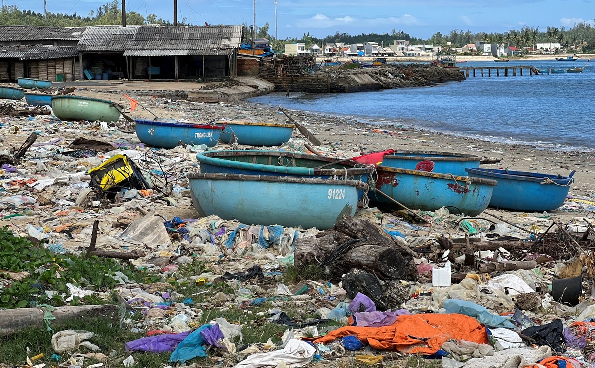 Rác thải giăng kín quanh các phương tiện hành nghề của ngư dân chuyên đánh bắt gần bờ.