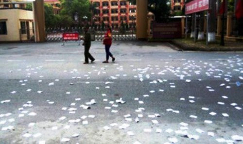 Phao thi giả bị rải trắng khu vực trước cổng trường THPT Nguyễn Trãi vào cuối buổi thi kỳ thi THPT quốc gia 2017.