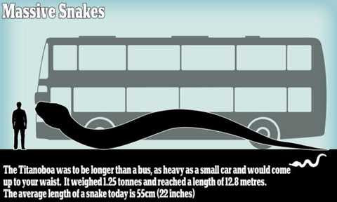 Titanoboa là loài rắn dài hơn một chiếc xe buýt nặng vài tấn và có thể nuốt trôi mọt con bò dễ dàng. Chúng đã từng trườn khắp rừng Nam Mỹ 60 triệu năm trước đi cả vào trí tưởng tượng của con người trong bộ phim Anaconda.