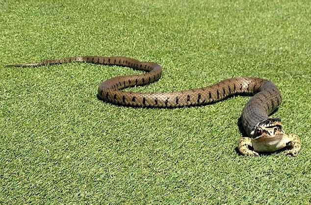 Sự việc xảy ra ở lỗ golf số 17 của câu lạc bộ Gloucestershire, Anh khi một con rắn bò vào sân cố gắng nuốt chửng một chú ếch.