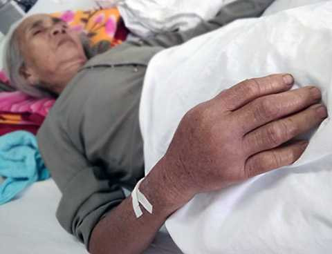 | Cụ Điềm bị rắn lục đuôi đỏ cắn đang nằm điều trị tại Bệnh viện đa khoa Tây Hòa. Ảnh: Ngọc Thắng. |