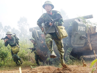 Cửa xe bật mở, từ bên trong mỗi xe, một tiểu đội chiến sĩ ào ra cùng đồng đội bên ngoài triển khai đội hình chiến đấu. Trên thao trường, ánh thép các loại vũ khí như AK47, B41, cối 100mm, súng phòng không 12,7mm nhấp nhoáng trong khói bụi mịt mù…