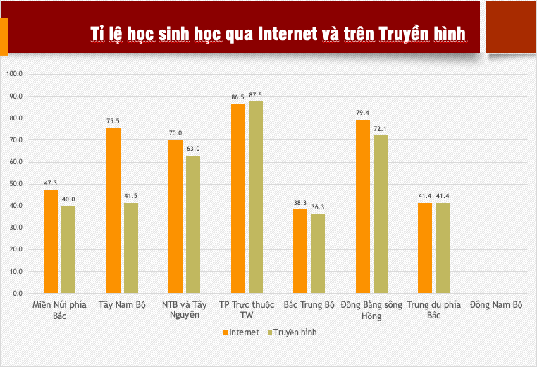 Tuy nhiên, ở nhiều vùng, tỷ lệ học sinh học trên internet và truyền hình đạt thấp, như các địa phương thuộc Bắc Trung Bộ chỉ đạt 38,3% và 36,3%; Trung du phía Bắc đạt 41,4% học sinh cả học trên internet và truyền hình; Miền núi phía Bắc đạt 47,3 và 40%…