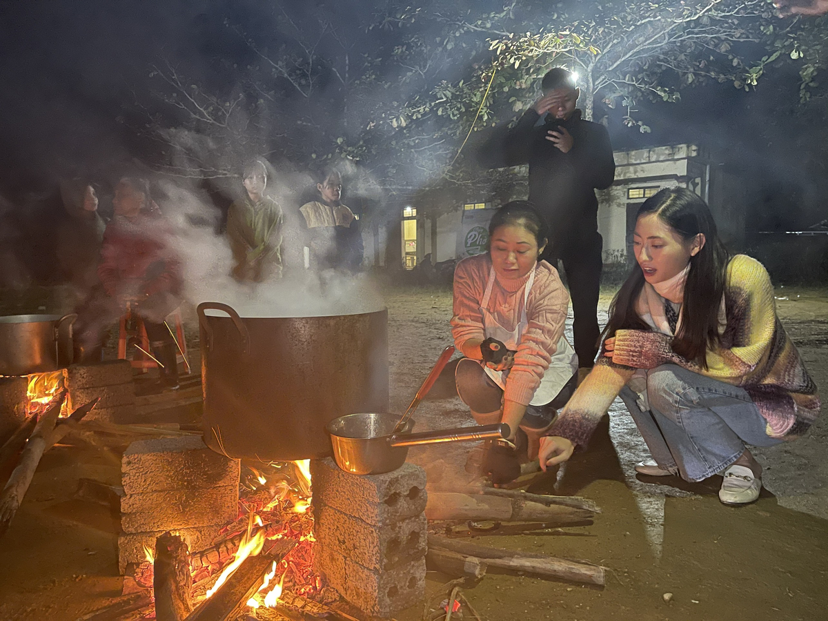 Giữa núi rừng thiếu thốn cơ sở vật chất, hoa hậu cùng các thành viên khác vẫn nấu đảm bảo đủ số lượng phở bằng bếp củi. Ngay cả tiết trời lạnh 12 độ cũng không thể cản trở nhiệt huyết của Lương Thùy Linh. Cô thức xuyên đêm để chuẩn bị món quà ý nghĩa này cho các em nhỏ.