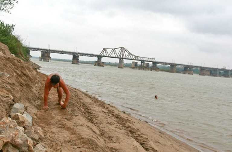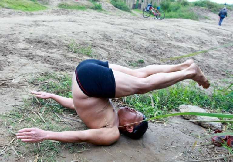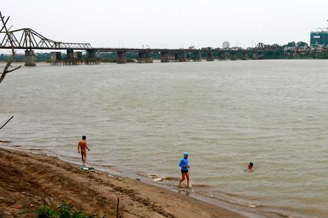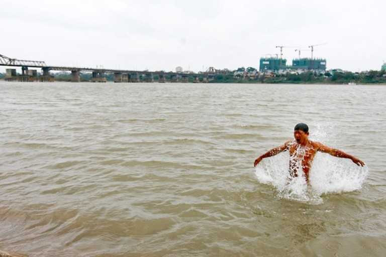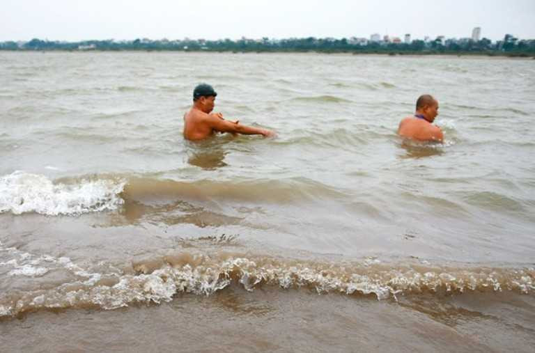 Chiều qua, Hà Nội đang đón đợt rét mới, nơi này vẫn có nhiều người tìm đến tắm. Một người đàn ông cao tuổi đang khởi động cho nóng người trước khi nhảy xuống sông.