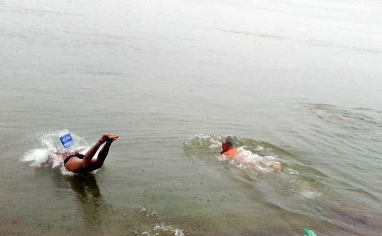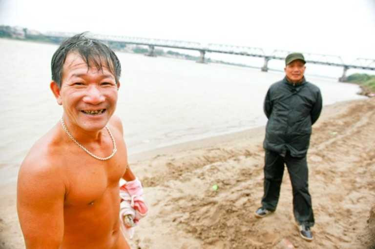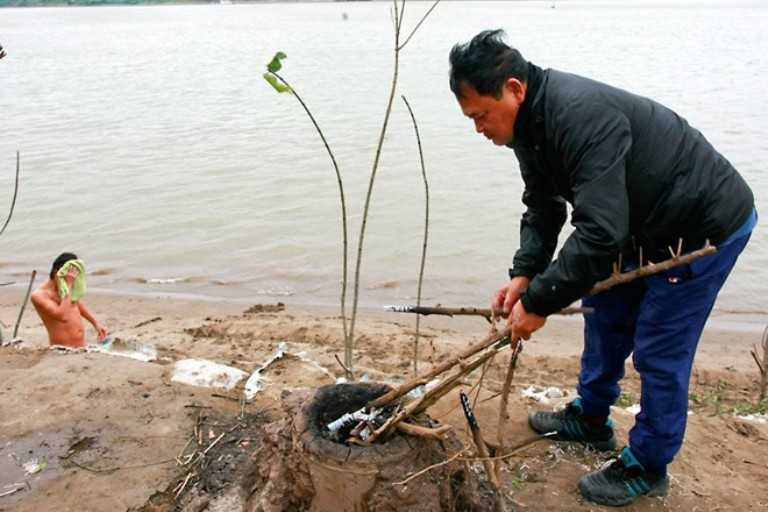 Trên bờ, một đống củi đốt sưởi ấm không ai chăm sóc đang dần tắt vì các anh mải vùng vẫy dưới nước.