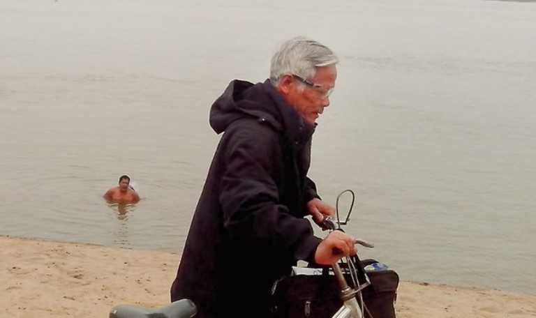 Một cụ già đi xe đạp từ nơi xa đến bơi. "Một ngày mà không ra đây là không chịu được", cụ vừa dắt xe vừa nói.