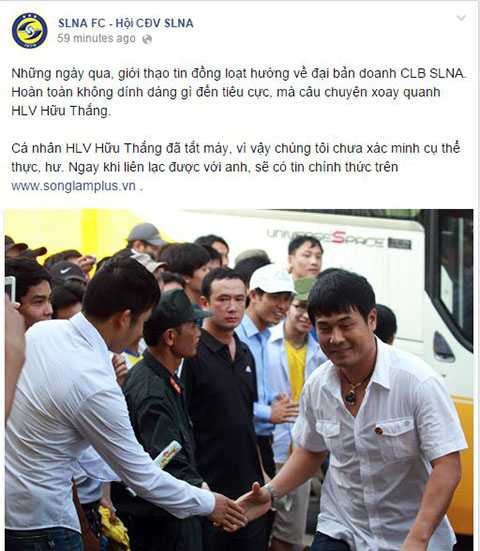 Trang facebook của Hội CĐV SLNA tiết lộ: "Những ngày qua, giới thạo tin đồng loạt hướng về đại bản doanh CLB SLNA. Hoàn toàn không dính dáng gì đến tiêu cực, mà câu chuyện xoay quanh HLV Hữu Thắng."