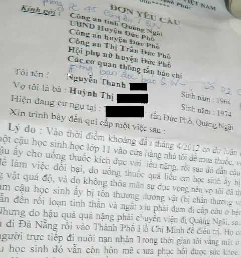 Hơn 2 tuần qua, người dân Quảng Ngãi không khỏi "sốc" trước thông tin, một nam sinh lớp 11 bị bà chủ tiệm thuốc tây lớn ở thị trấn Đức Phổ lừa cho uống thuốc kích thích tại nhà và ép quan hệ nhiều giờ liền.
