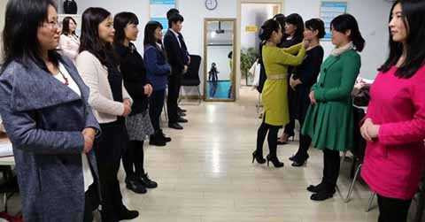 | Giáo viên giúp học viên sửa lại cách đứng và biểu cảm khuôn mặt khi giao tiếp |