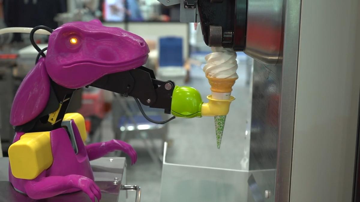Tiệm kem tại Nhật Bản đã dùng robot bằng nhựa, cách điệu dưới hình dạng khủng long và các con vật để bán kem tự động, nhằm hạn chế sự tiếp xúc trong mùa COVID-19.
