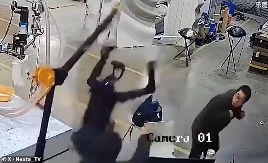 Sự việc xảy ra ngày 1/5 tại một nhà máy Trung Quốc, khi con robot được gắn với một cần cẩu thu nhỏ bất ngờ nổi cơn thịnh nộ và tấn công con người. Người đàn ông ngồi sau máy tính gần đó cúi đầu xuống tránh đòn, trong khi một người khác đứng sau con robot phải lùi lại.