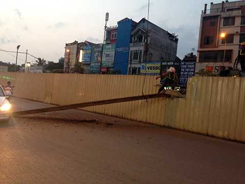 Nhiều người dân đi qua hiện trường cho hay, khi chiếc cẩu đang nâng thanh dầm thép lên cao, bất ngờ thanh dầm tuột khỏi cần cẩu rơi xuống chắn ngang đường. Ngay sau đó, nhiều công nhân vội vã chạy ra đường, dùng cáp móc vào đầu thanh dầm cẩu vào bên trong.