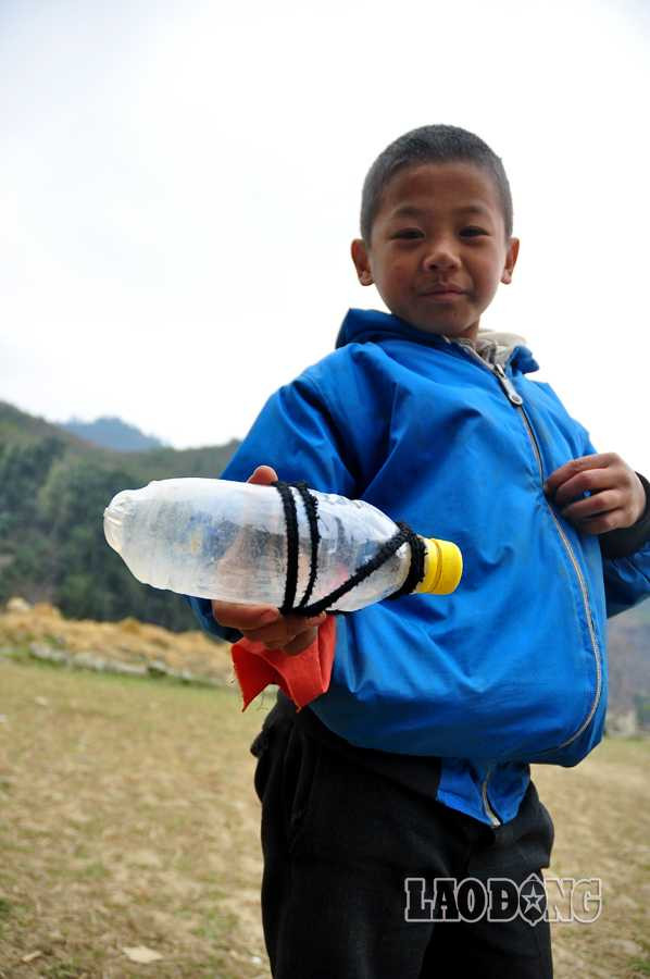 Do không làm được những con quay bằng gỗ, các em dùng những chai nước nhỏ quấn dây vải để chơi cùng nhau. |
