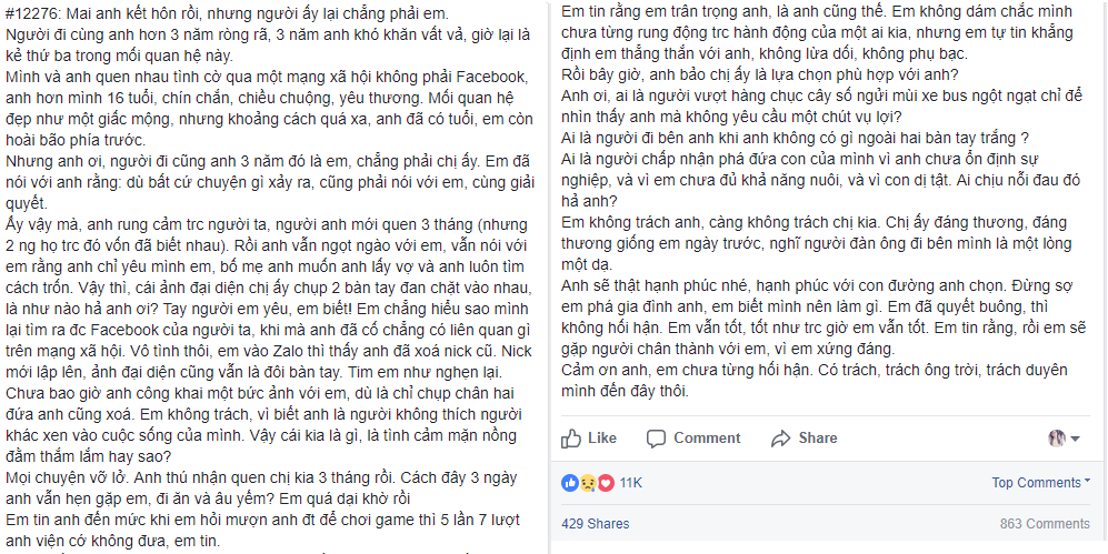 Ngay sau khi đăng tải, confession này đã nhận được hơn 11 ngàn lượt like và gần 1 ngàn comment từ phía cộng đồng mạng. Đa số là comment từ phía các bạn nữ và những người đã trải qua bi kịch như cô gái trên.