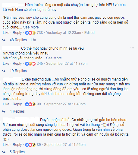 Còn FB N.T. L thì bày tỏ quan điểm như sau: “Không còn là kiểu thất tình rầu rĩ đơn thuần mà câu chuyện ở đây đã là tổn thương thật sự, là nỗi đau thật sự. Người phụ nữ sau khi mất con thứ cô ấy cần nhất là người đàn ông của cô ấy bên cạnh san sẻ, vỗ về. Cô gái ạ, mất đi nhiều thật, nhưng chưa hẳn là mất tất cả. Cố lên!”