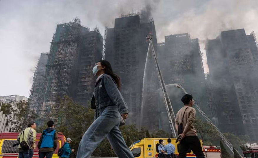 Căn phòng nhỏ tại Hội trường cộng đồng Kwong Fuk dán đầy những bức ảnh nạn nhân vụ cháy Wang Fuk Court. Bóng của những tòa chung cư vẫn âm ỉ khói phía sau như nhắc nhở về thảm họa chết chóc nhất Hong Kong trong nhiều thập kỷ.