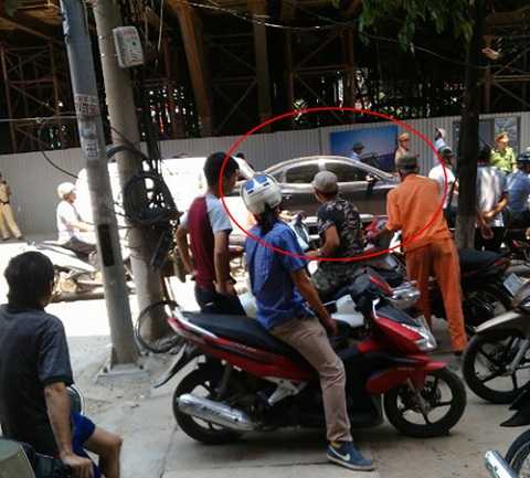 Trong lúc dọn vệ sinh công trình, một công nhân đã bất cẩn đá vào thanh sắt ở phía trên khiến thanh sắt rơi trúng ô tô 4 chỗ màu đen đang lưu thông trên đường Quang Trung.