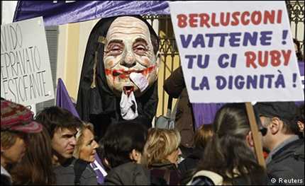 Một số người biểu tình cũng đã bày tỏ khinh miệt với vị Thủ tướng này sau khi các nhà lãnh đạo thuộc G20 đặt nền kinh tế đang gặp khó khăn của Italy dưới sự giám sát chặt chẽ trong bối cảnh thiếu tin tưởng vào các cam kết cải cách của ông Berlusconi.