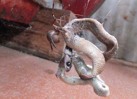 Còn con rắn nâu bị mắc trên mạng nhện được xác định thuộc một trong những loài rắn độc nhất thế giới.