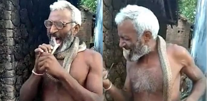 Người đàn ông Ấn Độ vô tư để rắn hổ mang quấn quanh cổ như khăn quàng, thậm chí liều lĩnh ngoạm đầu con vật khiến người xem rùng mình.