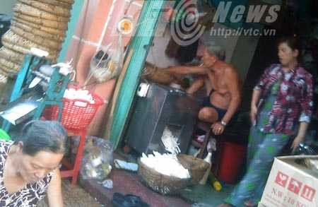 Ngồi bên máy cắt cơm dừa thái nhỏ là người đàn ông khoảng 65 tuổi, chỉ độc chiếc quần cụt, miệng phì phèo điếu thuốc lá, ngồi trên chiếc ghế đẩu, chân gác lên cao. Người này dùng tay trần hốt từng miếng cơm dừa bỏ vào lỗ chiếc máy cắt, sau đó lại lấy tay ngấy đảo liên tục những sợi cơm dừa đang chạy đổ xuống thúng (rổ) tre dưới đất. Thỉnh thoảng ông lại khạc đờm vào một góc vách tường, người chứng kiến vội vàng quay chỗ khác không dám nhìn.